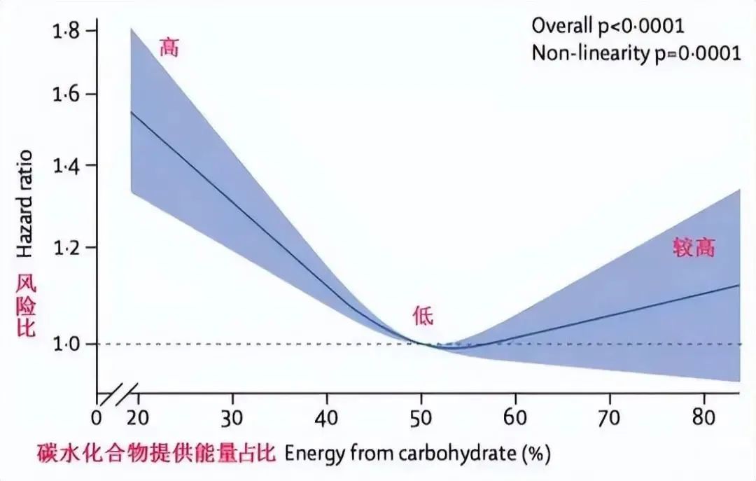 总体碳水化合物摄入与预期寿命之间存在U型关联,主食摄入占能量占比50~55%时,死亡风险最低;当摄入量<40%或>70%时,死亡风险均会增加,其中摄入量<40%的死亡风险更高。