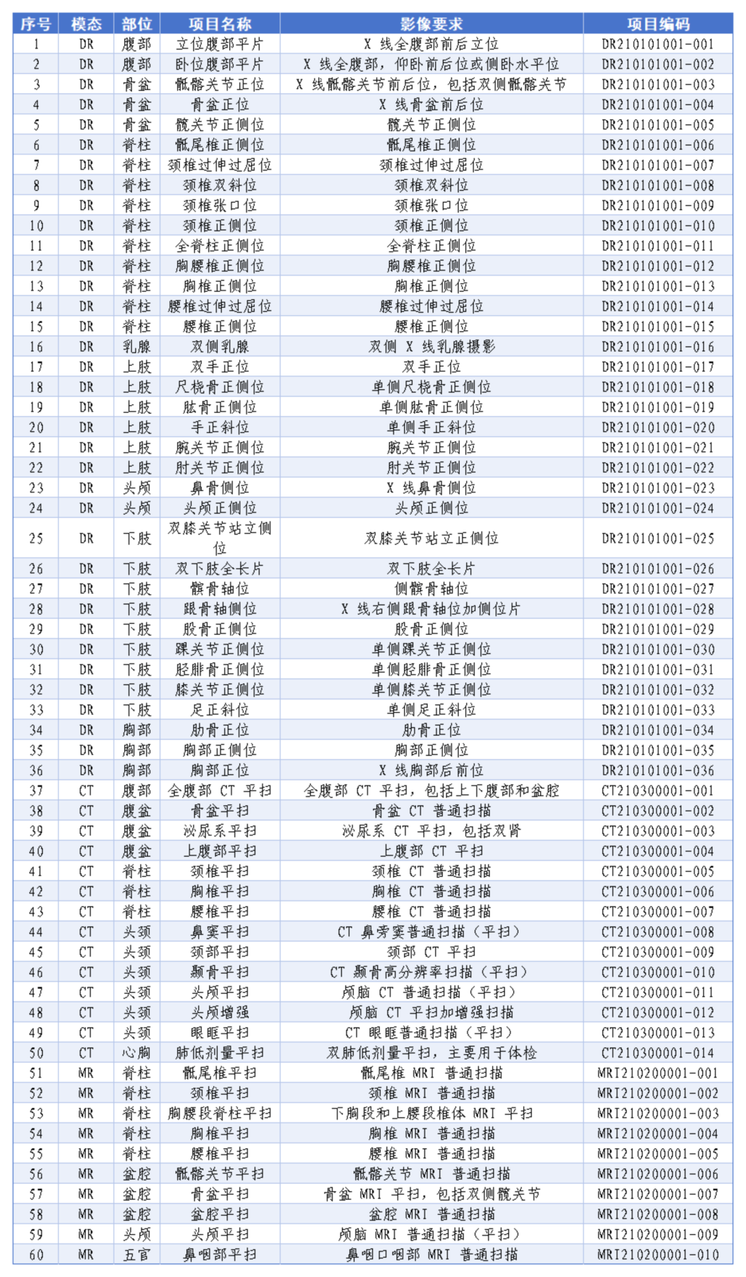 检查项目(110 项):涵盖全身各系统影像检查,包括胸部 CT、腰椎 MRI、膝关节 DR、乳腺钼靶、腹部超声等,无论是常见病筛查还是疑难病转诊,关键影像结果均可跨院复用。