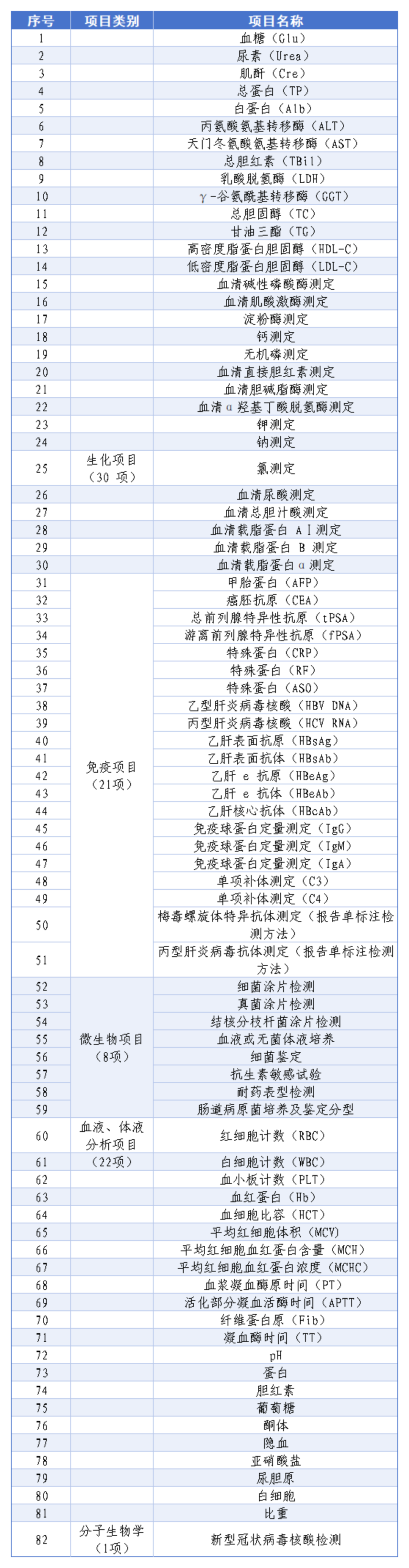 检验项目(120 项):不仅包含血常规、尿常规、血糖等基础项目,更将甲胎蛋白(AFP)、癌胚抗原(CEA)等肿瘤标志物,乙肝五项、丙肝抗体等传染病筛查,甲状腺功能全套、血脂分型等慢性病管理项目纳入互认,满足从健康体检到疾病诊疗的全周期需求。