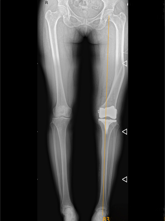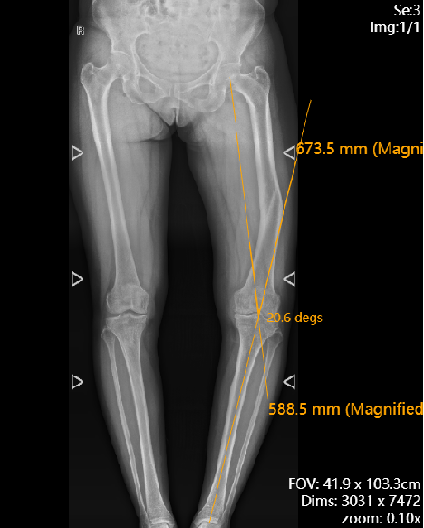 经过检查发现,她的膝盖已经明显内翻(膝盖往里歪),关节间隙一边窄一边宽,常规手术很难兼顾假体安装精度和膝盖稳定性,手术难度不小。