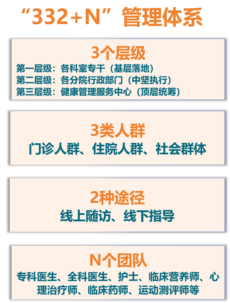 以“三师共管”模式为纽带(专科医生、全科医生、健康管理师)以“五大处方”为抓手(药物处方、运动处方、营养处方、心理睡眠处方、戒烟限酒处方),构建具有突破性的“332+N”管理体系(3层级质控体系、管理3类人群、运用2种途径、汇聚N个团队),实现慢病患者全病程服务覆盖,切实降低慢性病疾病负担。