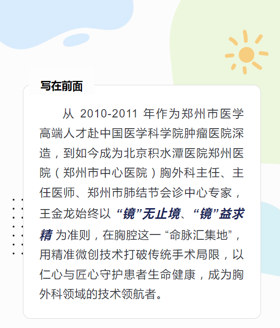 从 “微创小切口” 到 “精准单孔胸腔镜”,从 “ERAS 理念落地” 到 “团队技术传承”,王金龙用十余年的坚守证明:医者的匠心,藏在 3 厘米切口的精准里,显在数千例手术的零差错中,更写在患者康复的笑容间。