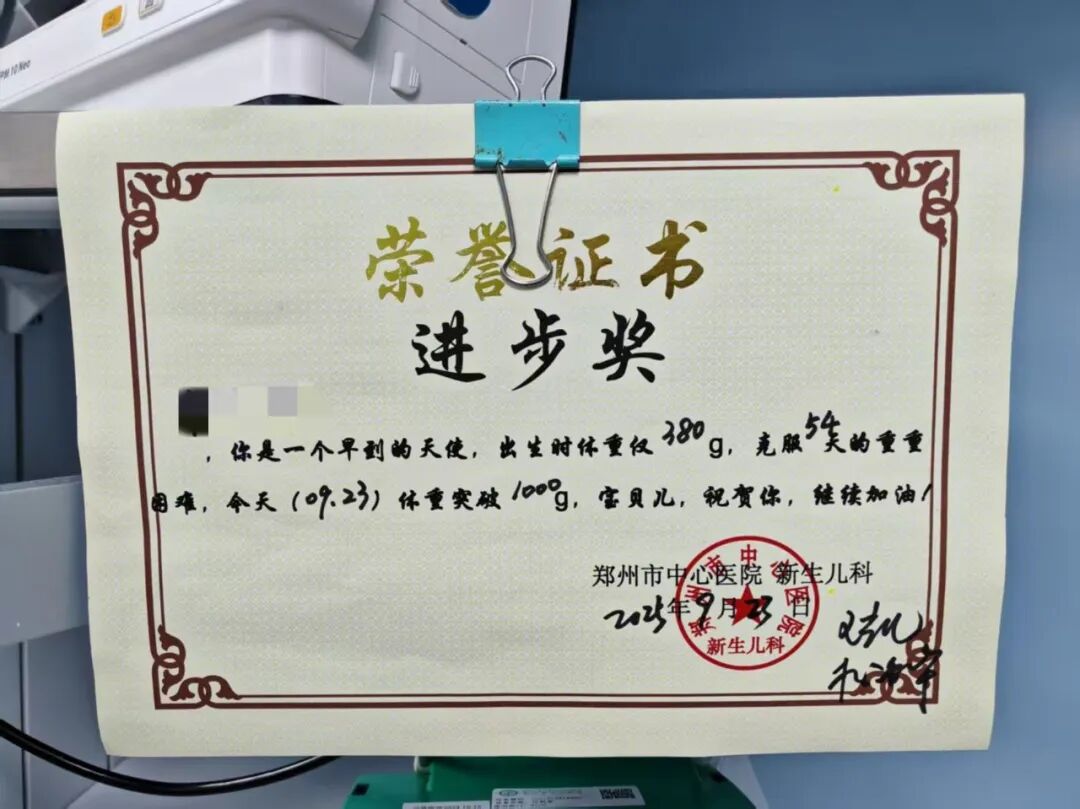 “点点”生后第7周拔除了气管插管,第8周体重达到了1000克。为了表彰“点点”的努力,科室的“临时父母们”为她颁发了人生的第一个奖状。