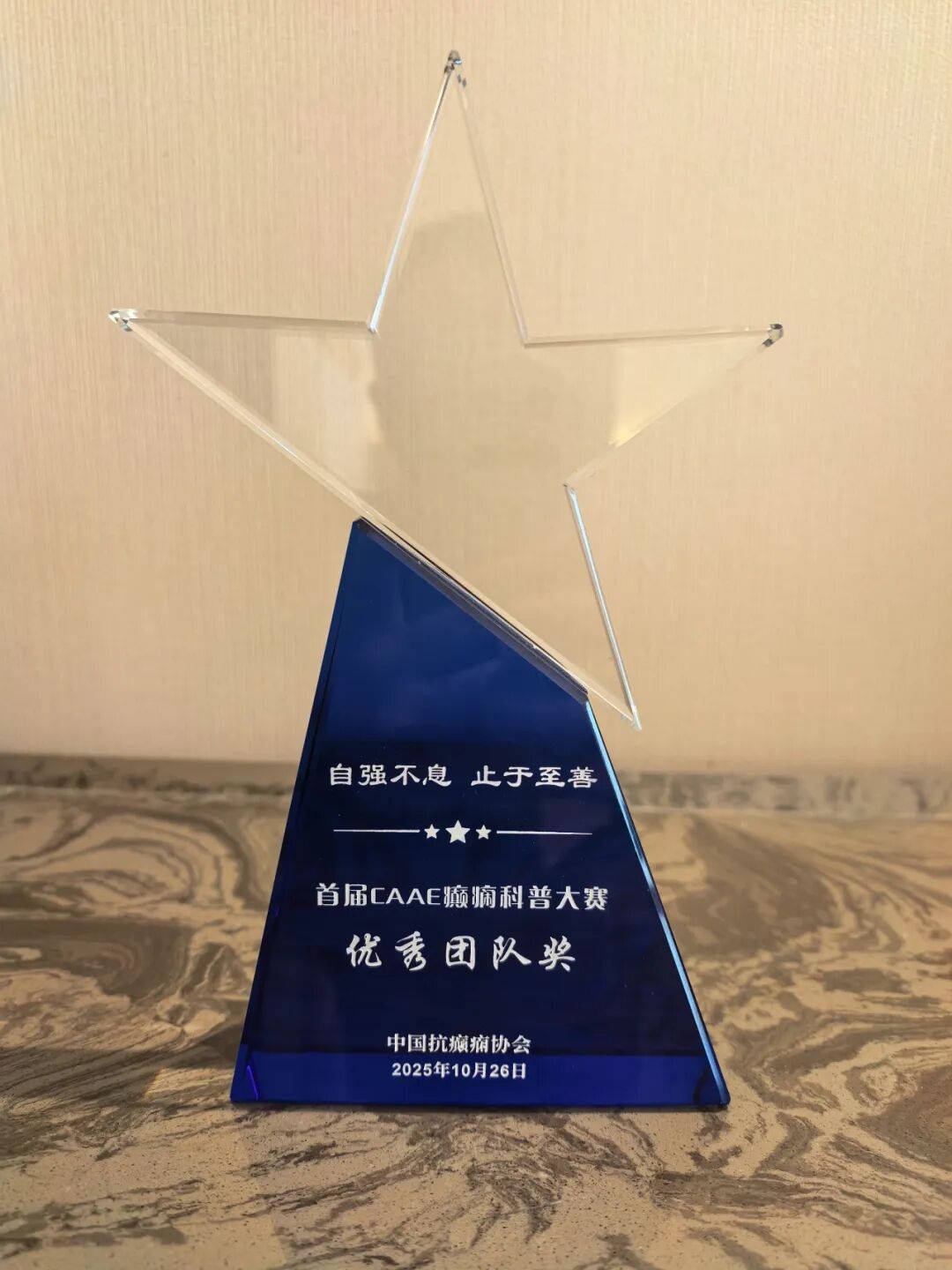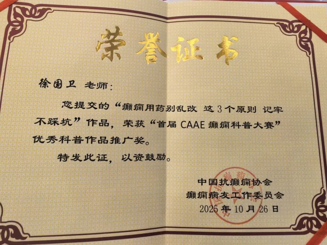 作品凭借通俗易懂的语言、贴合患者需求的实用内容,直击公众对癫痫用药的认知盲区,最终斩获 “优秀科普作品推广奖”,为提升全民癫痫用药安全意识、守护患者用药健康贡献了专业力量。