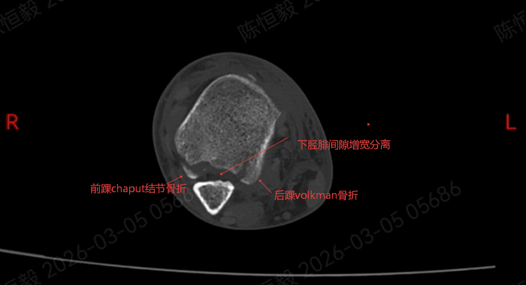 王大爷听从建议住院后,经完善体格检查及 CT 检查,最终确诊为复杂的 Maisonneuve 骨折:不仅存在下胫腓分离,还合并前踝 Chapute 结节撕脱骨折、后踝骨折、内踝骨折,同时伴有腓骨高位骨折。