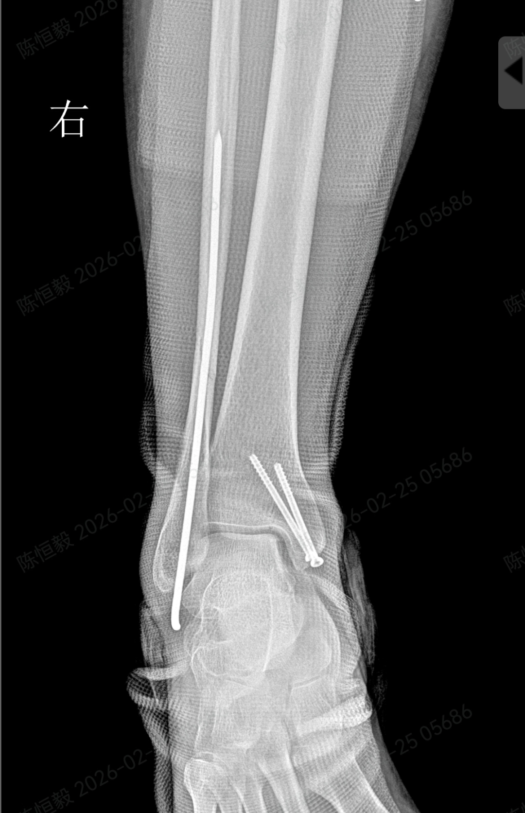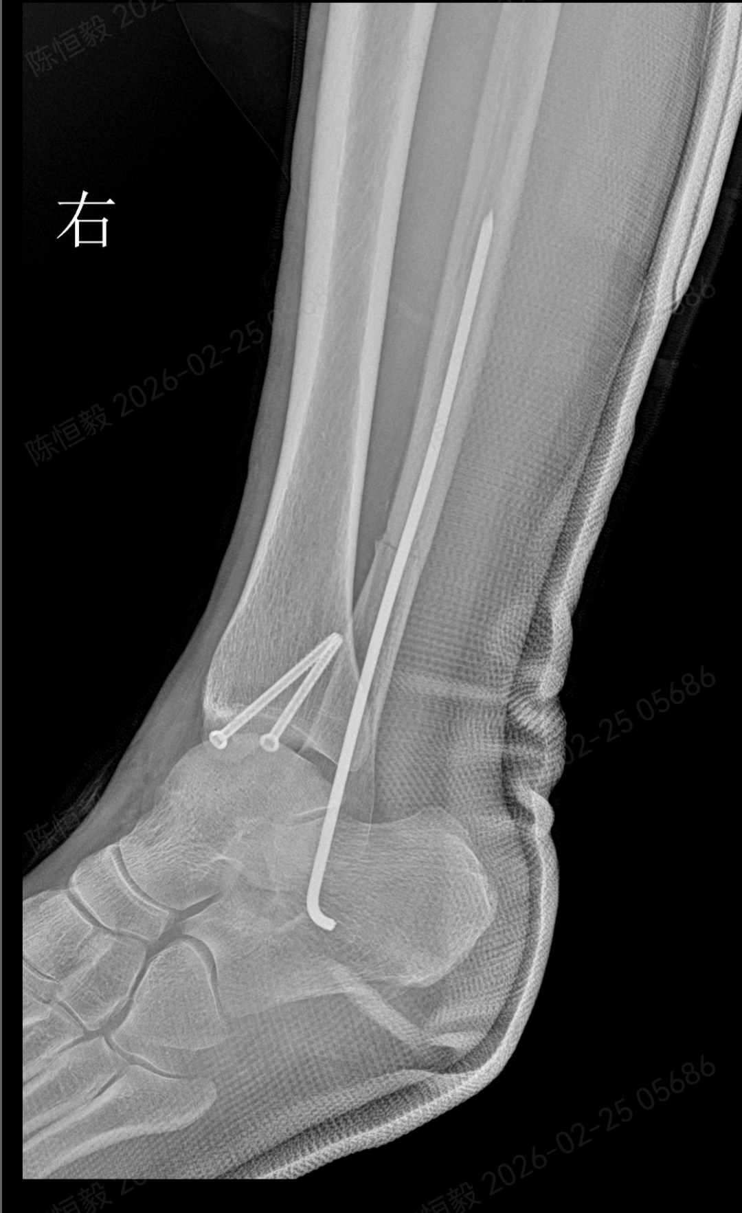 最后通过另外两个 5 毫米的小孔置入空心螺钉,完成骨折端的稳定固定。